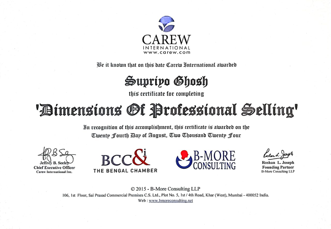- Successfully completed a certificate course on “MDP on marketing Management” from MSME-DI, Kolkata.