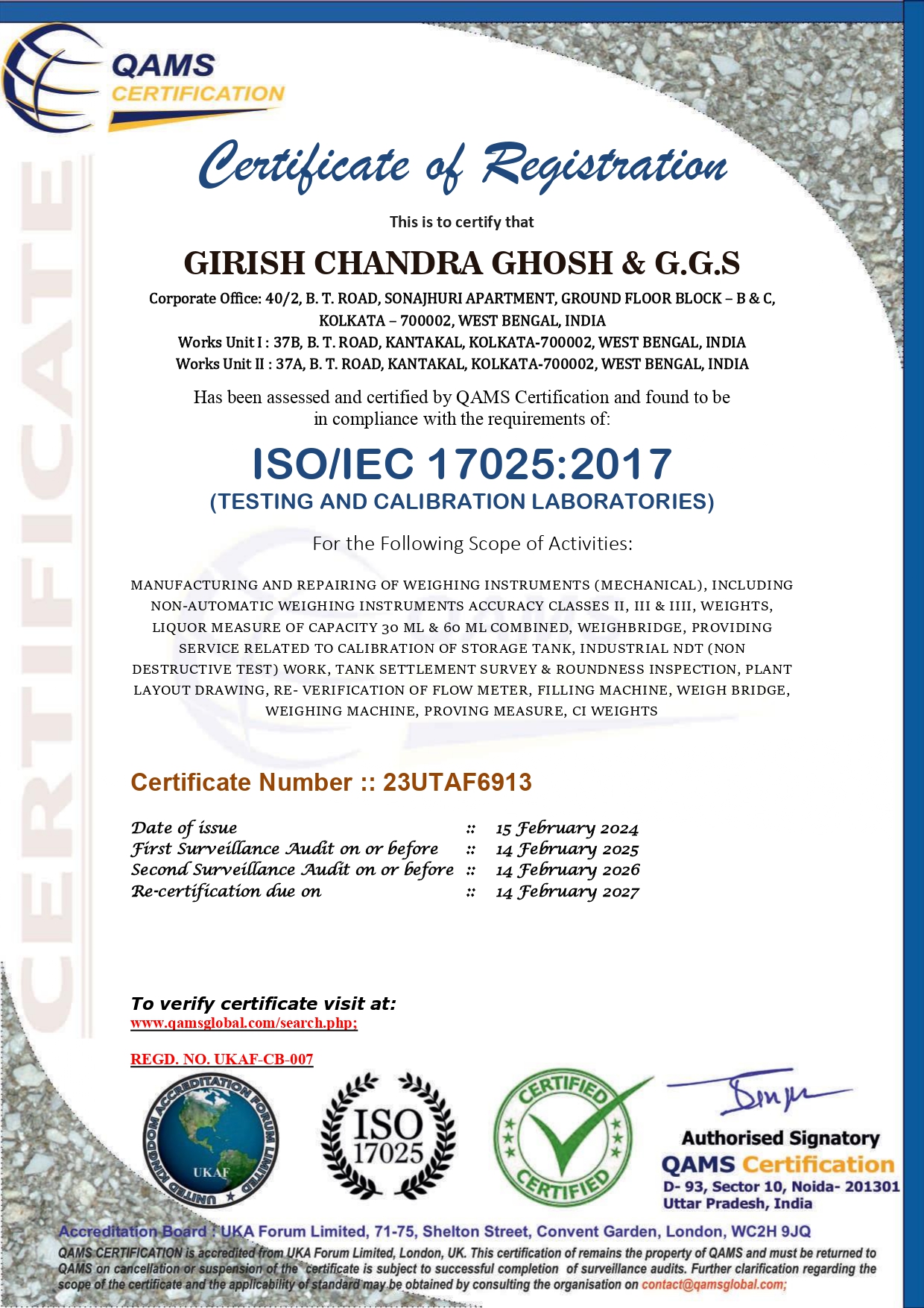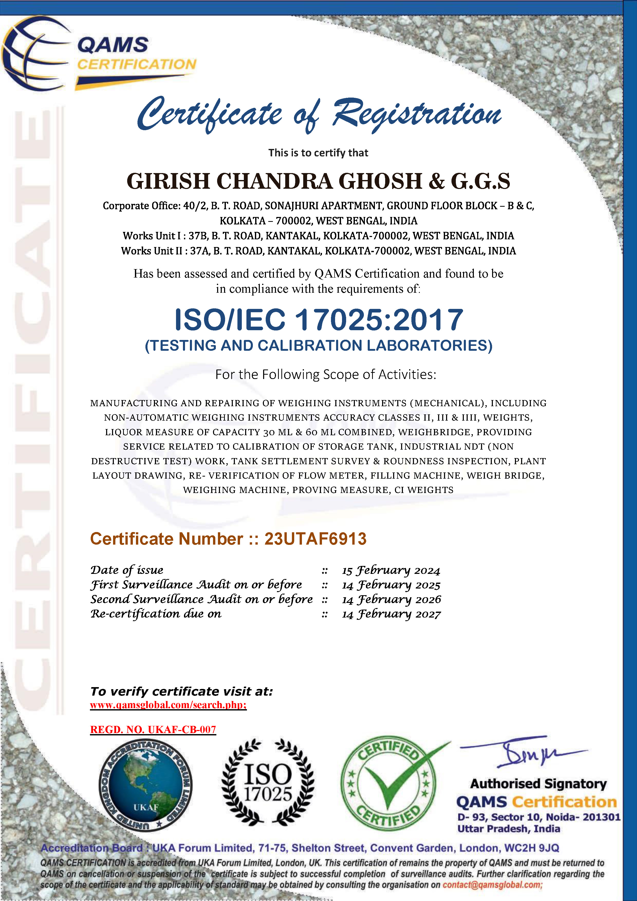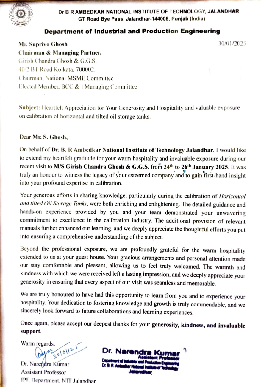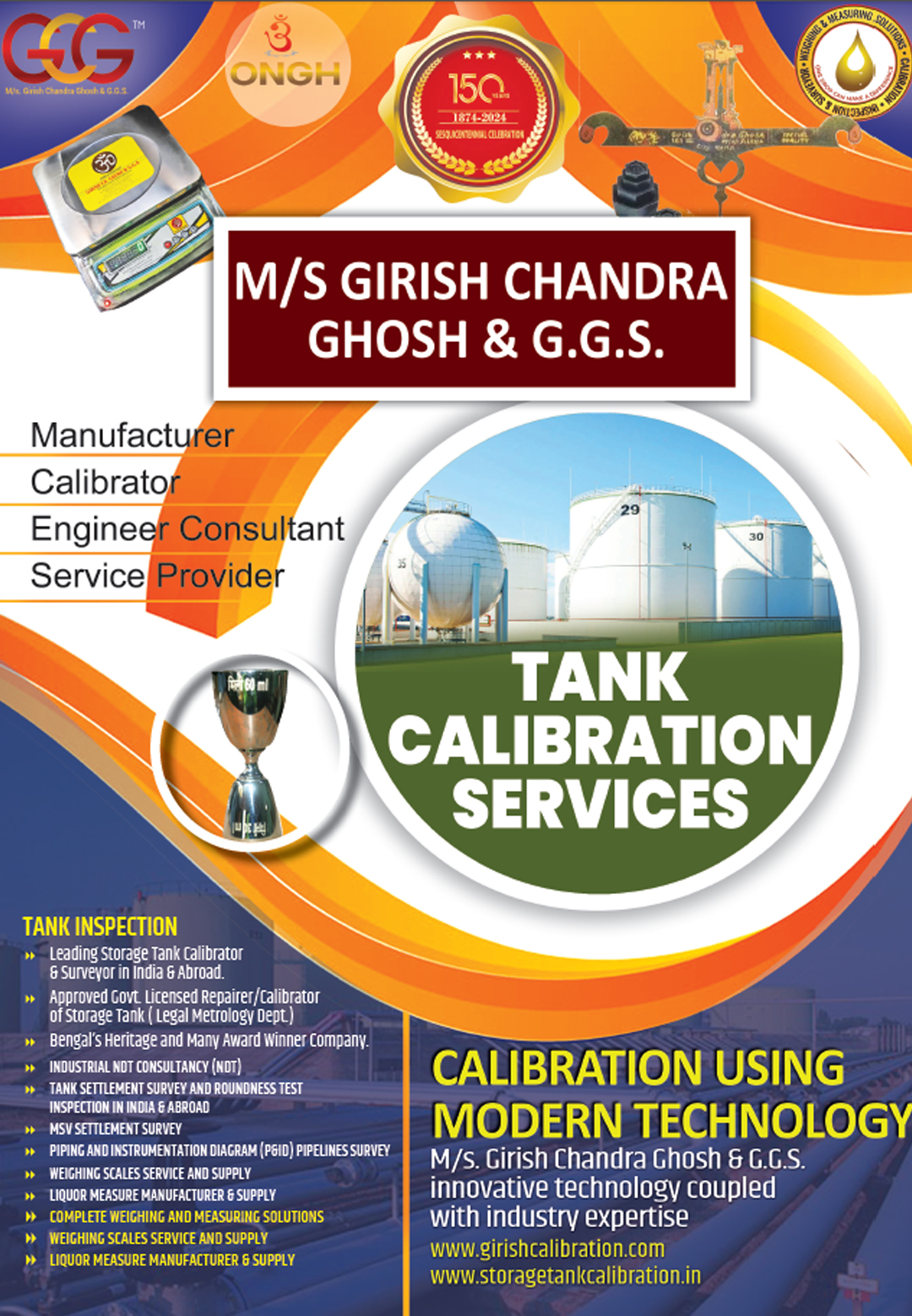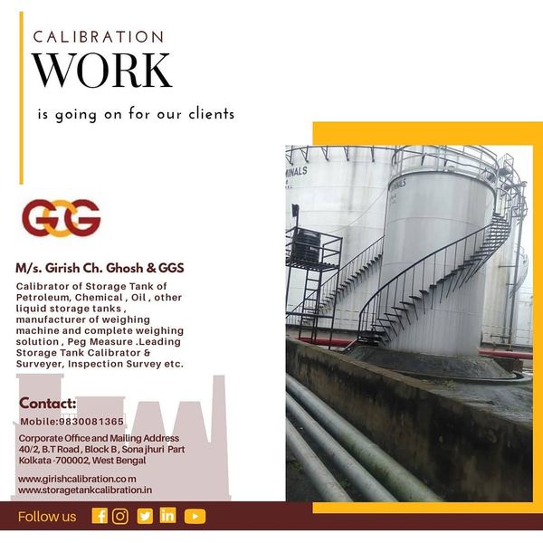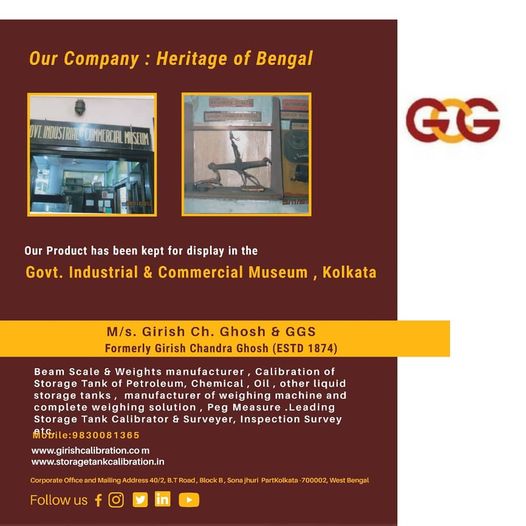 a)A Short brief on Weights and Measure b)Volumetric Measurement & Storage Tank Calibration Technology Appreciation from Indian Institute of Technology (Indian School of Mines), Dhanbad Jharkhand for valuable exposure on Calibration of Vertical Oil Storage Tank. Appreciation from Department of Industrial and Products Engineering for Valuable exposure on Calibration of Horizontal and tilted Oil Storage Tanks. Certificates of Proficiency NDT Level II in Magnetic Particle Test & Ultrasonic Test Managing Partner of M/s. Girish Chandra Ghosh & G.G.S. (formerly M/s. Girish Chandra Ghosh estd. In 1874). Growing with technology and committed to quality, we are an eminent manufacturer (Electronic Weighing machine) and service provider (Storage Tank calibrator) offering our products & service to the clients in different industries. As a pre-eminent Storage Tank calibration company established over forteen decades ago, Girish Chandra Ghosh & G.G.S., over the years, strongly developed itself into leading Tank calibrator of India. Today, it is acknowledged as a company that has spread their dedicated service all over India with good reputation. Girish Chandra Ghosh & G.G.S.is an Engineeringcompany currently working in different projects in oilcompanies acrossIndia. Girish Chandra Ghosh & G.G.S.employs over 30 fulltime and contractual employees. Its head office is located in Kolkata, India along with offices in Haldia& new Delhi. The company’s reputation as a manufacturer is that of a total solution provider for electronic weighing machines with best of infrastructure. And 'Care' provides the key for unlocking its potential and making it real. The company’s 1,000 sq. ft. workshops, equipped with the latest and best maintenance and repair machineries along with several qualified & dedicated staffs strengths. Company Website : www.girishcalibration.com / www.storagtankcalibration.in Flourishing rapidly, we have made significant progress on the national platform& in the process of expansion internationally also. Backed our strong infrastructure, we have grown in multi folds. Keeping pace with the industrial demands and needs, we have expanded our wings far and wide. Serving clients in different industries, we have one sister concerns with their area of operations in same field. Our sister concerns are : M/s. Ghosh Calibration & Engineering Co. Multicare Equipment M/s. Global Engineering Co. Girish Chandra Ghosh & Calibration Co. G.H. Welfare Foundation Trust (Social Welfare Trust) Participated in the Live phone-in program titled “KENAKATAR SATSATERO” of Kolkata Doordarshan on 2013 to discuss “Role of Small & Medium industry in consumer protection” along with Shri Smarajit Chaudhuri, Deputy Assistant Director, Consumer Affairs & Fair Business Practices. Organised a program on “Consumer Right &AffaIrs” with the presence of Sri Sadhan Pandey, Hon’ble Minister–in-charge, Consumer Affairs Department, Govt. of West Bengal & ShriVivek Bharadwaj, IAS Secretary, Consumers Affair Dept., Govt. of West Bengal in 2013. Organised a program on “Importance of Legal Metrology” with the presence of Mr. SajalKanti Jana, Joint Controller of Legal Metrology dept., Govt. of West Bengal in 2014. Received Certificate of Diploma in Honour in the Calcutta Industrial Exhibition (1902-1903). Received Silver medal Award in 1954 at Kalyani Industrial Exhibition; received from PanditJawaharlal Neheru, honourable Prime Minister of India in presence of Dr. Bidhan Chandra Roy, Chief Minister of West Bengal on Metric Scale System adopted in India. Received Memento of Appreciation from IOCL, Haldia Refinery as enlisted Vendor in 2009. Received several Appreciations from Indian Institute of Legal Metrology, Kanke, Ranchi, of Dept. of Consumer Affairs, Govt. of West Bengal for the excellence in Tank Calibration job in 2009, 2010 & 2012. Received The FOSMI Award of Excellence in Service Sector (2nd prize) in 2010; received from Mr. Somnath Chatterjee, Ex. Loksabha Speaker & from Mr. Manab Mukherjee, MSME Minister, Govt. of West Bengal. Received Certificate & Memento of Appreciation in the seminar on storage tank calibration from Legal Metrology Dept Odisha in 2011. Received The Indian Leadership Award for Industrial Development from All India Achiever’s Foundation at New Delhi in 2011. Received Bharat Gaurav Award from Association for Economic Growth & Social Development at New Delhi in 2012. Received The FOSMI Award of Excellence in Service Sector (1st prize) for Outstanding achievement in Service sector received from Mr. Saugata Roy, Minister of Urban Development, Govt. of India in 2012. Achieved The Bengal Chamber Awards for Excellence in Manufacturing Practices in MSMEs - 2013 (3rd Prize) received from Mr. Partha Chatterjee, Minister of Commerce & Industries, Govt. of West Bengal. Winner of AWARD OF EXCELLENCE for Outstanding Achievement in Service Sector, 2013: received from Dr. A.P.J. Kalam, former President of India. Winner of Bengal Chamber of Commerce Special Jury Award in service sector , 2013: received from Mr. K. H Muniyappa, Central MSME Minister. Award for Outstanding Entrepreneur from F.A.S. I. I in 2016 Award of Excellence in Service sector from B.C.C & 1 in 2017 Entrepreneur Excellence Award Business Accelerator Summit 2018, kolkata Presented to Shri Supriyo Ghosh, M/s Girish Chandra Ghosh & G.G.S, WB Certificate Award of Excellence in Service Sector from Dr. Manas Bhunia (MLA) Minister SSI. Falicitaion From ALOE FERA as North Kolkata Entrepreneur 2018. BISWA BANGLAR GAURAV as Entrepreneur & Social Worker 2020. Award for Overall performance of the year 2021-2022 from Rotary Club Budge Budge Venue: Calcutta Club. (3rd August 2022) Heritage and Old Company Award of the year 2021-2022 from Bangla Hunt (Bengals largest media Digital network) Venue: Fairfield Marriot. (30th July, 2022) Award for Best Heritage Brand of the Year 2023 For Outstanding Contribution to Brand Development and Innovation From Unive