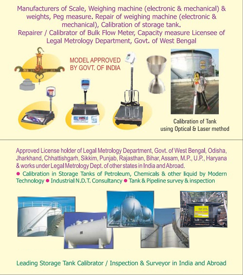Manufacturers & Repairer of scale, weighing machine (electronic & mechanical) & weights. Repairer / calibrator of bulk flow meter, ultrasonic thickness ganging, capacity measure License Legal Metrology Department, Govt, of West Bengal.